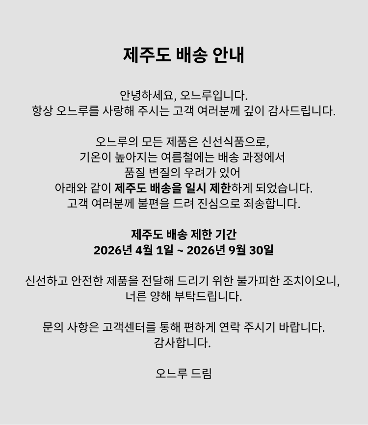 - 오느루의 모든 제품은 재판매가 불가한 상품의 특성상, 단순 변심, 주문착오 시 교환 및 반품이 어려운 점 양해 부탁드립니다. 상품에 따라 조금씩 맛이 다를 수 있으며, 개인의 기호에 따라 같은 상품도 다르게 느끼실 수 있습니다